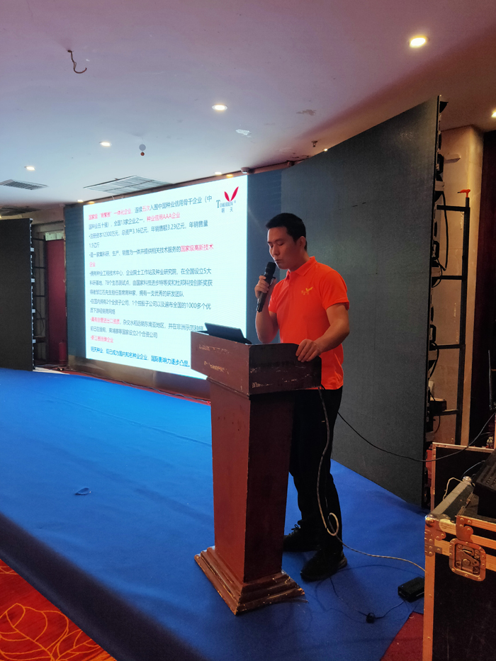本次會議由江蘇明天種業(yè)雜交水稻部副經(jīng)理曹恒主持!9月5日10:30伴隨著會場激揚的音樂,宣布會議開始!
