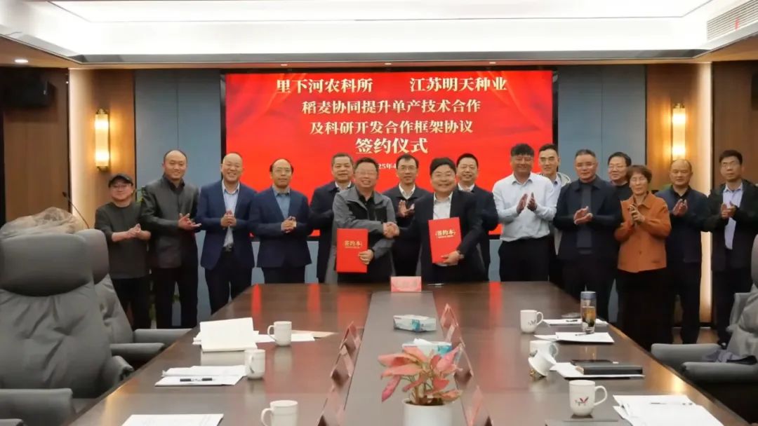 會上,江蘇明天種業科技股份有限公司總經理嚴輝民、江蘇里下河地區農科所所長李愛宏分別就《稻麥協同提升單產技術合作及科研開發合作框架協議》《兩系不育系“前88S”技術開發協議》進行現場簽約。